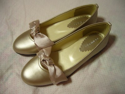 ゴールドのサテンリボンつきパンプス